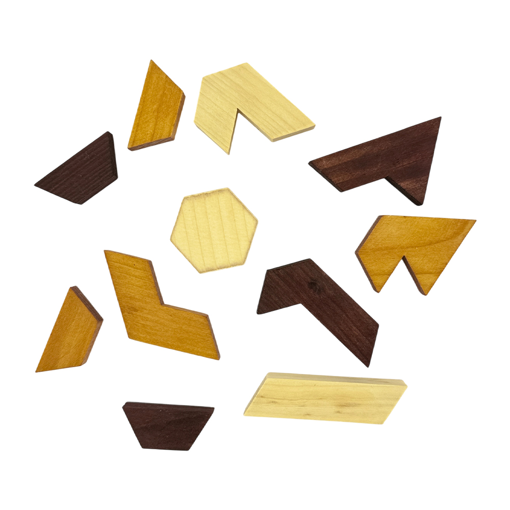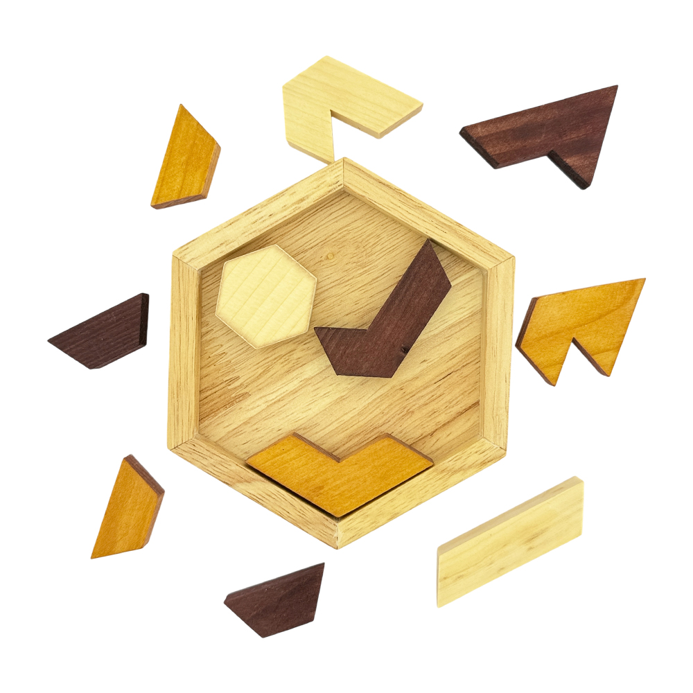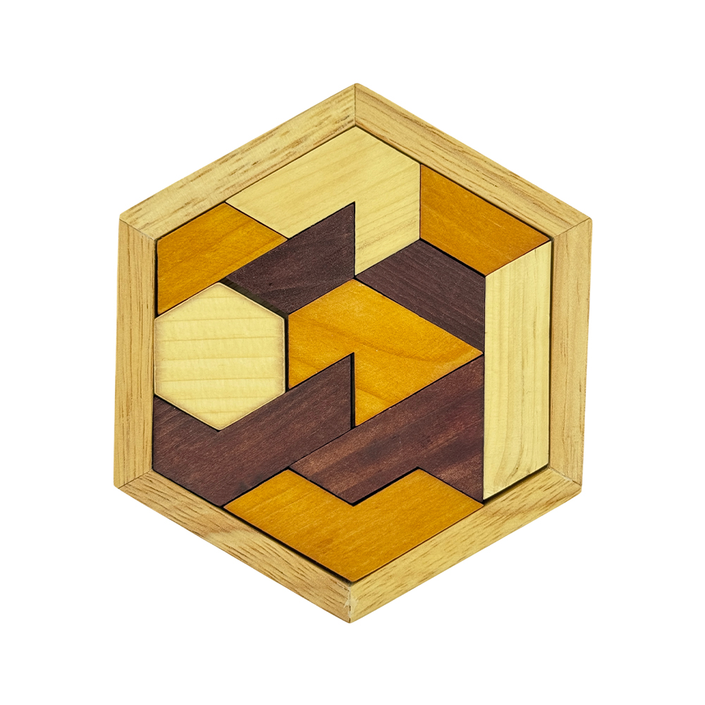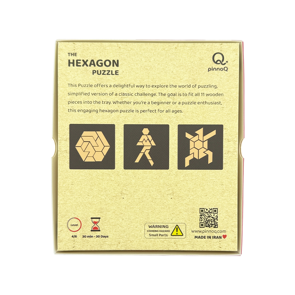 این پازل از چند قطعه‌ی ساده ساخته شده است که باید درون بُرد چوبی شش‌ضلعی کنار هم چیده شوند. در نگاه اول ممکن است کار آسان به نظر برسد، اما خیلی زود درمی‌یابید که پیدا کردن چینش درست قطعات، چالشی جدی و در عین حال لذت‌بخش است. نکته‌ی جذاب ماجرا آن است که تنها یک راه‌حل وجود ندارد؛ هر بار با چیدمانی تازه درون بُرد چوبی، ترکیبی متفاوت شکل می‌گیرد. همین ویژگی باعث می‌شود تجربه‌ی بازی هیچ‌گاه تکراری نشود و هر بار لذتی نو برای ذهن به همراه داشته باشد.